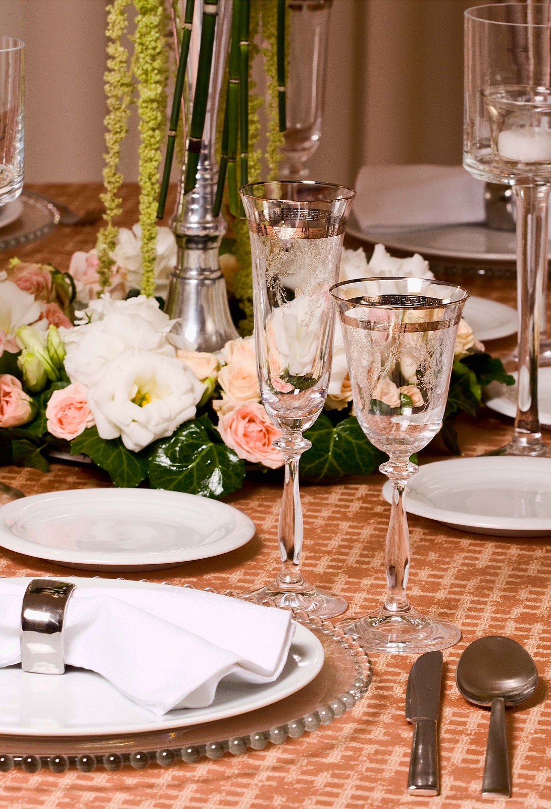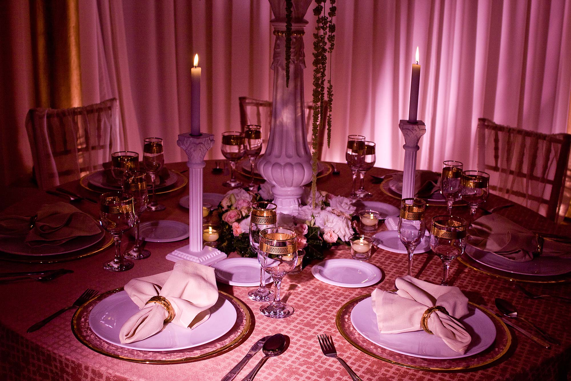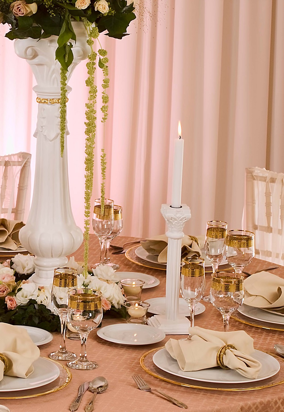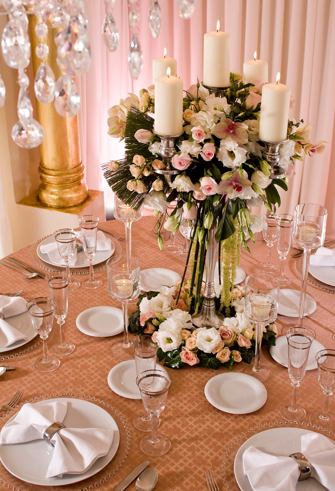 Combining the pink, cream and white shades from the cotton, polyester and silk materials adds to the softness of the whole setting. They form a contrast with the grey tones from the candlestick, completing the overall tableau.