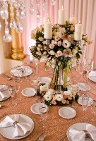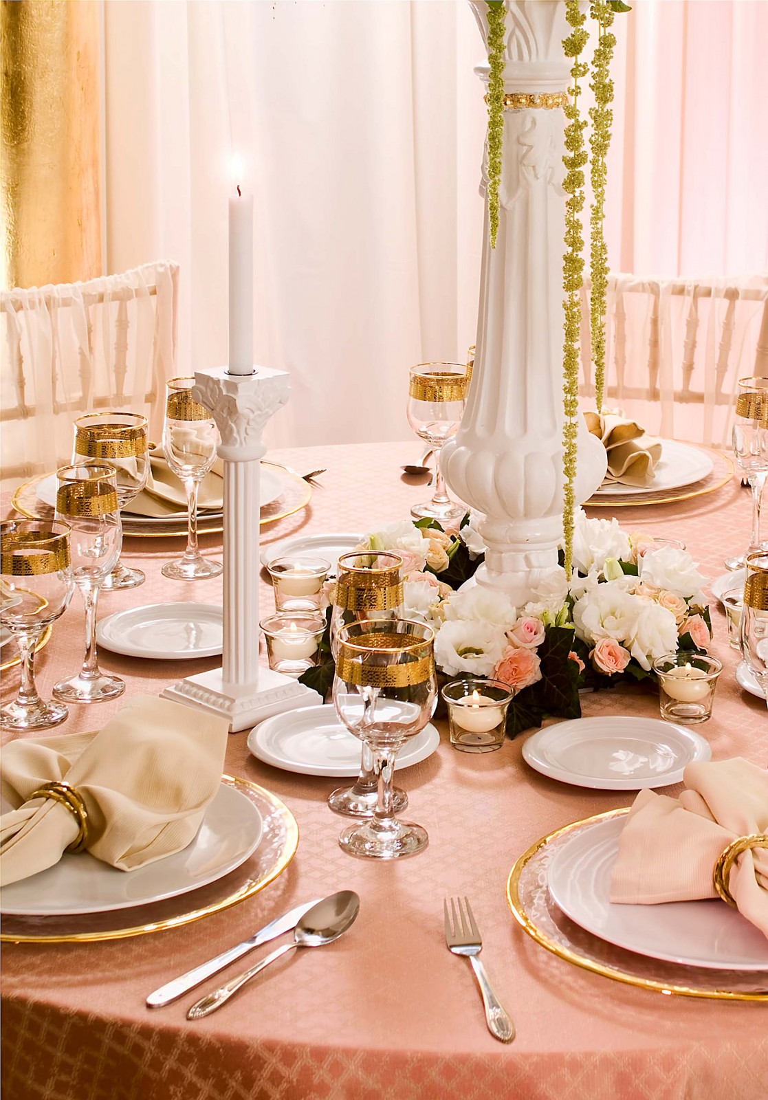 Combinația culorilor roz, crem și alb din materialele de bumbac, poliester sau mătase naturală conferă tabloului gingășie, iar nuanțele nichelate ale sfeșnicului sunt într-un subtil contrast, întregind cadrul de poveste.
